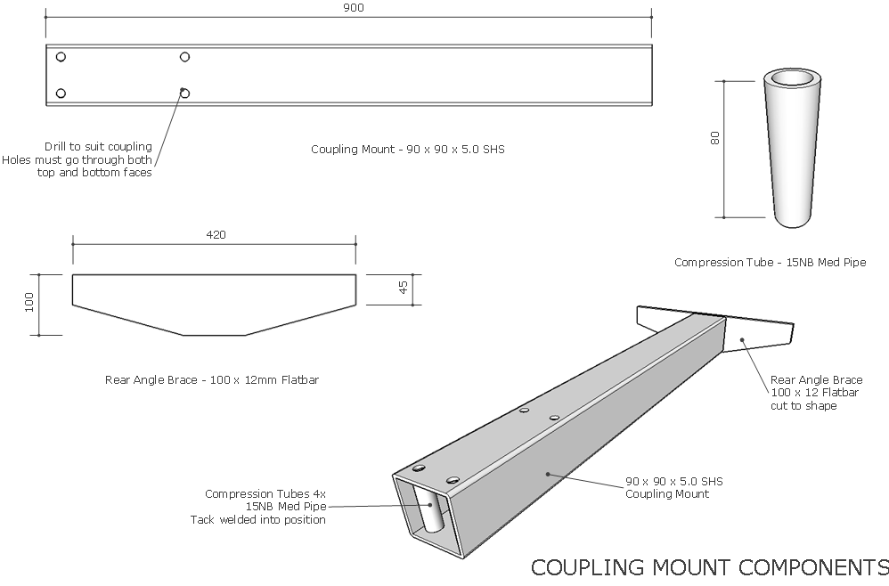 Compression tubes need to be fitted within the cavity of the coupling mount to prevent the deformation of the SHS when the coupling bolts are tightened. A rear drawbar brace gives added strength.